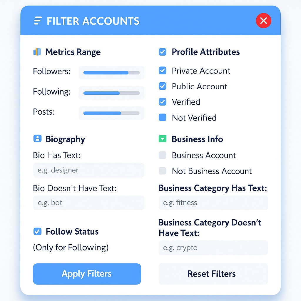 You can apply detailed filters to target accounts or media by follower count, following, posts, verified status, bio keywords, public/private status, business category, and more. This helps you focus only on the users that matter for your campaigns.