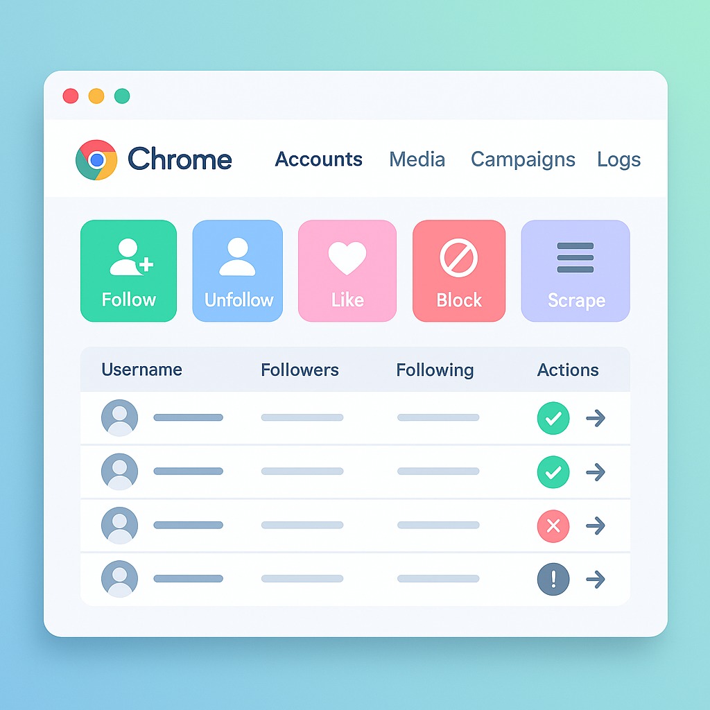 InstaPilot is a Chrome extension for smart Instagram automation. It lets you extract followers, likers, and media, automate actions (follow, unfollow, like, block, watch stories), and manage campaigns directly from a clean dashboard no coding or technical skills required.